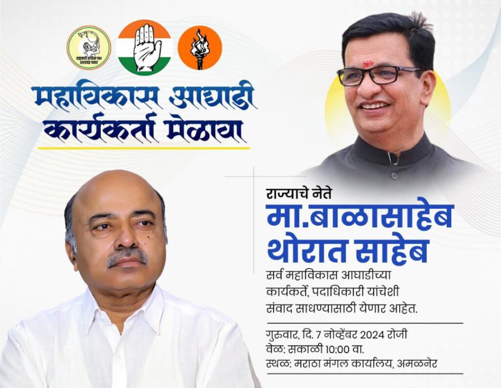 राज्याचे नेते काँग्रेसचे गटनेते बाळासाहेब थोरात यांची यावेळी उपस्थिती लाभणार असून गुरुवार ७ रोजी सकाळी १० वाजता शहरातील मराठा मंगल कार्यालयात बाळासाहेब थोरात यांची सभा आयोजित करण्यात आली आहे. मतदारसंघातील महाविकास आघाडीचे सर्व नेते, पदाधिकारी, कार्यकर्ते यांनी उपस्थिती लावावी, असे आवाहन महाविकास आघाडीचे उमेदवार डॉ. अनिल शिंदे यांनी केले आहे.