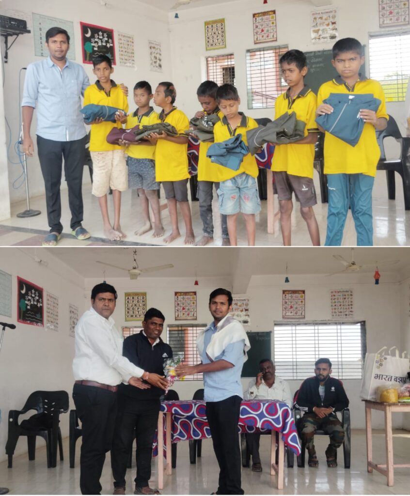 पारोळा येथील सावित्री फटाका फॅक्टरीचे संचालक उद्योजक श्री. विकास एकनाथ शिरोळे यांचे चिरंजीव युवा उद्योजक श्री तेजस विकास शिरोळे यांच्या वाढदिवसानिमित्त चामुंडा माता बहुउद्देशीय विकास परिसर धुळे संचलित परिश्रम दिव्यांग मुला मुलींची निवासी शाळा पारोळा येथील शाळेत दिव्यांग मुलांना स्वेटर, किरकोळ किराणाचे वाटप करण्यात आले. यावेळी श्री. विनोद धोत्रे, व मित्र परिवार उपस्थित होते.