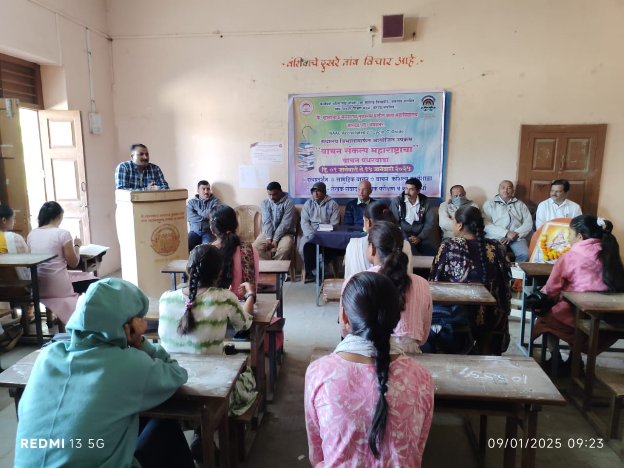 मारवड ता. अमळनेर येथील ग्राम विकास शिक्षण मंडळ संचलित कै.न्हानाभाऊ मन्साराम तुकाराम पाटील कला महाविद्यालयात “वाचन-संकल्प महाराष्ट्राचा ” आणि “वाचन पंधरवाडा” या निमित्ताने महाविद्यालयात ‘ लेखक-विद्यार्थी वाचन संवाद’ कार्यक्रम आयोजित करण्यात आला, कार्यक्रमाचे सूत्रसंचालन कोमल पाटील यांनी केले, तर प्रास्ताविक प्रा. डॉ. दिलीप कदम यांनी केले,यावेळी प्राचार्य डॉ. व्ही. एस. देसले अध्यक्ष होते. अध्यक्ष मनोगतात दि. 1 जानेवारी 2025 ते दि.15 जानेवारी 2025 वाचन पंधरवाडा महाविद्यालयात विद्यार्थ्यांसाठी आयोजित करण्यात आला आहे, महाविद्यालयाने या कालावधीत दरम्यान ग्रंथ प्रदर्शन, सामूहिक वाचन , वाचन कौशल्य कार्यशाळा, लेखक- विद्यार्थी वाचन संवाद अशी विविध कार्यक्रम घेऊन विद्यार्थ्यांचा सर्वांगीण विकासावर भर दिला आहे. वर्तमानपत्रे ,मासिके,ग्रंथ वाचण्याची आवड विद्यार्थ्यांमध्ये निर्माण व्हावी यासाठी अशा प्रकारची कार्यक्रम घेण्यात आले. कार्यक्रमाचे प्रमुख अतिथी प्रा. डॉ. संजय महाजन( हिंदी विभागप्रमुख) होते. कथा, कादंबऱ्या, नाटक अनेक विविध प्रकारचे वाचन साहित्य उपलब्ध आहे तरी विद्यार्थ्यांनी महाविद्यालयातील ग्रंथालयात असलेली पुस्तके वाचावीत त्यासाठी त्यांच्या ज्ञानात भर पडेल तसेच नेहमी मासिके ,वृत्तपत्रे ही वाचावीत. दररोज पंधरा मिनिटे पुस्तक वाचन करावे.असं मनोगतात सांगितले. कार्यक्रमाचे आभार नाजमीन पठाण हिने मानले, ग्रंथपाल विजय पाटील यांनी सदर कार्यक्रमाचे आयोजन ग्रंथालय-विभागातर्फे करण्यात आले होते. सदर कार्यक्रमाची सांगता राष्ट्रगीताने झाली. कार्यक्रमास महाविद्यालयीन सर्व प्राध्यापक आणि शिक्षककेतर कर्मचारी तसेच विद्यार्थी आणि विद्यार्थिनी उपस्थित होत.
