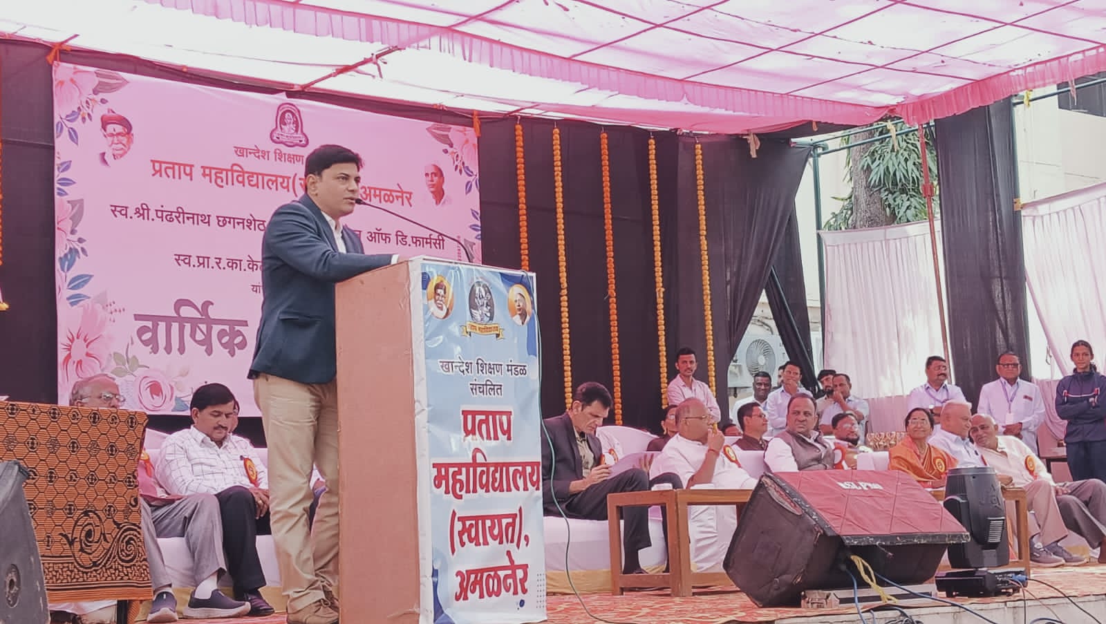 अमळनेर : येथील खान्देश शिक्षण मंडळ संचलित प्रताप कॉलेज व कॉलेज ऑफ फार्मसी यांच्या संयुक्त विद्यमाने आयोजित वार्षिक स्नेहसंमेलनाचे उद्घाटन समारंभ पार पडला. या कार्यक्रमाला प्रमुख अतिथी व उद्घाटक म्हणून लाभलेले डॉ.रोहित धर्माधिकारी यांनी आपल्या व्याख्यानात सांगितले की, स्पर्धेचे युग आहे. विद्यार्थ्यांनी खूप मेहनत करावी . मेहनत करून प्रताप महाविद्यालयाचे नाव उज्वल करावे. प्रताप महाविद्यालय हे पालन – पोषण करणारी आई आहे. असे मत व्यक्त केले.