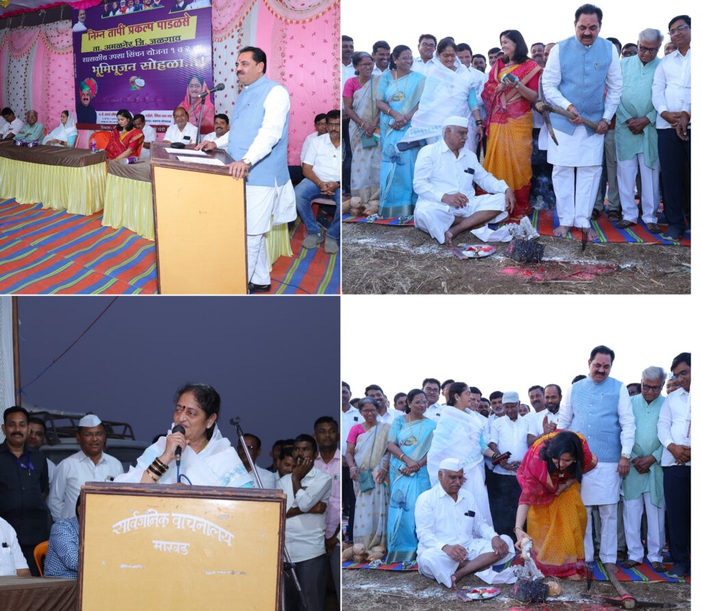 शासकीय उपसा सिंचन योजना 1 व 2 चे खेडी (वासरे) येथे थाटात भूमिपूजन करण्यात आले. यावेळी खासदार स्मिताताई वाघ, माजी जि प सदस्या सौ जयश्री अनिल पाटील, धरण जनआंदोलन समितीचे अध्यक्ष सुभाष चौधरी, राष्ट्रवादी तालुकाध्यक्ष भागवत पाटील यांची प्रमुख उपस्थिती होती. यावेळी पुढे बोलताना आमदार पाटील म्हणाले की निम्न तापी पाडळसरे धरणावरील शासकीय उपसा सिंचन योजनेमुळे पहिल्याच टप्प्यात 25 हजार हेक्टर म्हणजेच सुमारे 70 ते 75 हजार एकर जमीन सिंचनाखाली येणार असून दुसऱ्या टप्प्यात हा आकडा दुपटीने वाढलेला असेल, यामुळे शेतकरी बांधवांचे जीवनमान उंचावणार आहे. मी काम करणारा माणूस असल्याने काम करूनच दाखवीत असून येणाऱ्या काळात योजना कार्यान्वित झाल्यानंतर शेतकरी भाकरीत आपला चेहरा बघतील असेच काम झालेले दिसेल, गेल्या पाच वर्षात मी पाडळसरे धरण सुप्रमा, महसूल ची नवीन प्रशासकीय इमारत, पंचायत समिती इमारत, बस स्टँड नुतनीकरण, ग्रामीण रुग्णालय चे उपजिल्हा रुग्णालयात रूपांतर, शहरातील विविध रस्ते, शहरात 200 कोटीची 24 बाय 7 (दररोज पाणीपुरवठा) नवीन पाणीपुरवठा योजना एवढी कामे मार्गी लावली असून या योजनेचे 27 कि.मी पाईप लाईन टाकण्याचे कामही सुरू आहे. त्यासाठी रस्त्यांची कामे थांबवली आहेत. खरे पाहता येणाऱ्या काळात