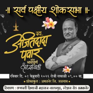 ♦️अमळनेर तालुक्यातील सर्व नागरिक , राजकीय पक्ष , सामाजिक कार्यकर्ते , पदाधिकारी ,व्यापारी ,शिक्षक , शासकीय कर्मचारी , आशा वर्कर्स , लाडक्या बहिणी ,डॉक्टर्स , लायन्स ,रोटरी , महिला मंडळ , निमशासकीय कर्मचारी , महसूल संघटना ,वकील संघ , पत्रकार संघ ,धरण संघर्ष समिती , शिक्षक शिक्षकेतर कर्मचारी , प्राध्यापक संघ , मंगळग्रह संस्था , स्वामींनारायण संस्था , संत सखाराम महाराज वाडी संस्थान ,भाजीपाला विक्रेते ,अंगणवाडी सेविका,पोलीस पाटील ,ग्रामसेवक ,तलाठी ,नगरसेवक , एस टी कर्मचारी ,टॅक्सी युनियन, सर्व समाज पंचमंडळ,फोटोग्राफर संघटना तसेच इतर सर्व संस्था याना कळवण्यात येते की , राज्याचे उपमुख्यमंत्री ,एक दमदार नेतृत्व सर्वांचा लाडका अजित दादा दुर्दैवाने अकाली आपल्याला सोडून गेले. त्यांना सामूहिक आणि सर्वपक्षीय श्रद्धांजली अर्पण करण्यासाठी *दि १ फेब्रुवारी २०२६ रोजी सकाळी ९ वाजता छत्रपती शिवाजी महाराज नाट्यगृह, अमळनेर येथे शोकसभा* आयोजित करण्यात आली आहे.