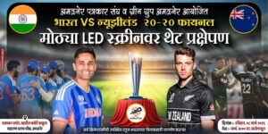 अमळनेर : भारत आणि न्यूझीलंड यांच्यात ८ मार्च रविवारी संध्याकाळी ७ वाजता होणाऱ्या २०-२० क्रिकेट फायनल सामन्याचा थरार क्रिकेटप्रेमींना एकत्रितपणे अनुभवता यावा यासाठी अमळनेरमध्ये मोठ्या LED स्क्रीनवर थेट प्रक्षेपणाची व्यवस्था ग्रीन ग्रुप, अमळनेर व अमळनेर शहर व तालुका पत्रकार संघ यांच्या कडून राज भवन समोर,तहसील कचेरीच्या येथे बाजूला,करण्यात आली आहे.