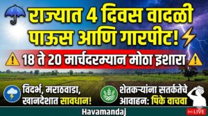 राज्यातील काही भागांमध्ये 17 ते 20 मार्च दरम्यान मेघगर्जनेसह पाऊस, विजांचा कडकडाट आणि वादळी वाऱ्यांची शक्यता हवामान विभागाने व्यक्त केली आहे. हा परिणाम प्रामुख्याने विदर्भ, मराठवाडा, खानदेश आणि मध्य महाराष्ट्रातील काही भागांमध्ये जाणवू शकतो. 18 ते 20 मार्च दरम्यान परिस्थिती अधिक तीव्र होण्याची शक्यता असून काही ठिकाणी गारपीट होण्याचीही शक्यता आहे.